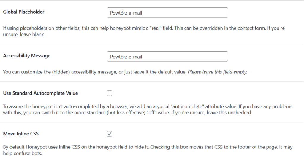 By utrudnić botom rozpoznanie pola honeypot, umieść je pomiędzy pozostałymi polami. Ponadto warto skonfigurować wtyczkę i ustawić placeholder tak, by pole naśladowało pozostałe. Warto również zaznaczyć opcję, by wtyczka przenosiła style inline do stopki strony.